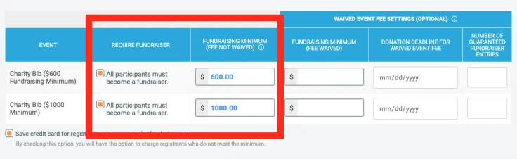 - Require Fundraiser and Fundraising Minimum (Fee waived): All event participants must become a fundraiser to participate. The registration fee is waived and fundraisers agree to pay the fundraising minimum by the specified deadline.