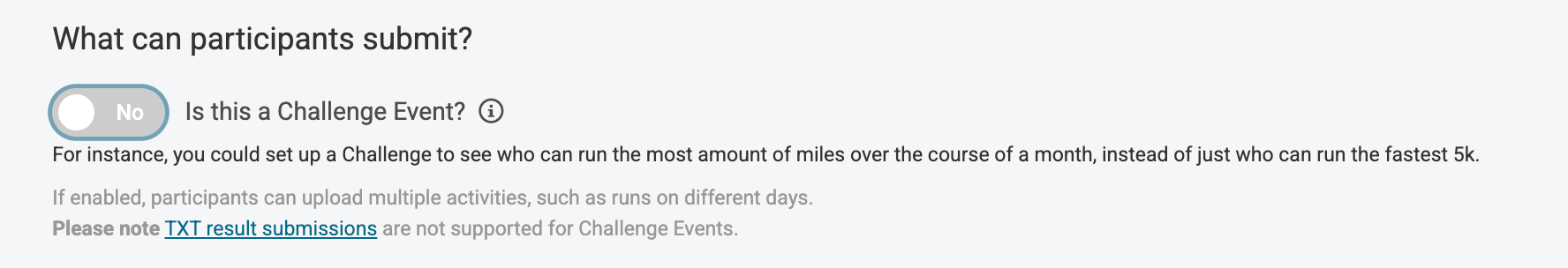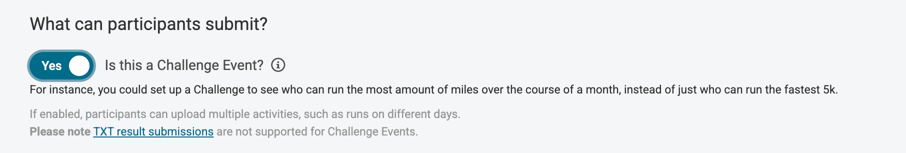 The next field let's you indicate whether your participants can upload multiple activities, such as runs on different days. This is useful for Challenge Events, which you can read more about on our blog and/or you can visit our Challenge Platform specific page for more information on.