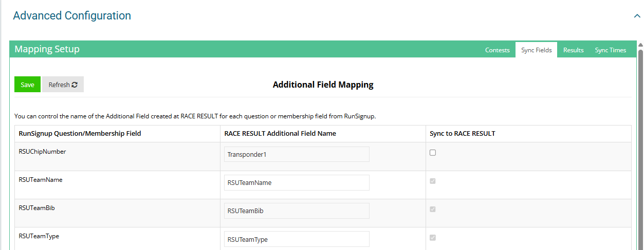 The configuration for RACE RESULT listings to RunSignup Results is covered in the following document. Please review the mapping terminology and the steps to configure results sync here: