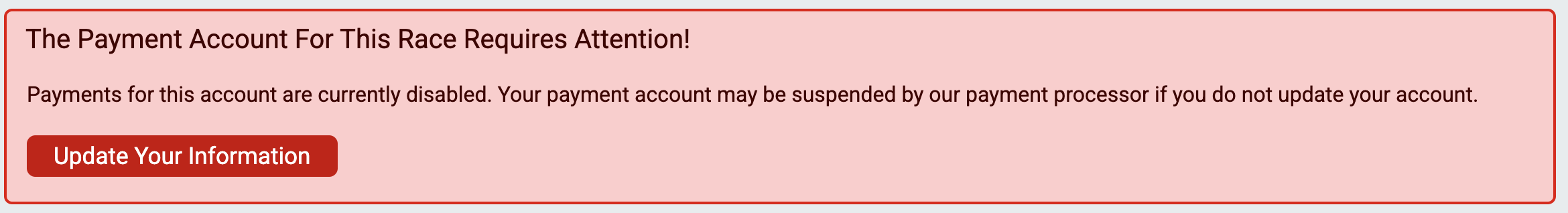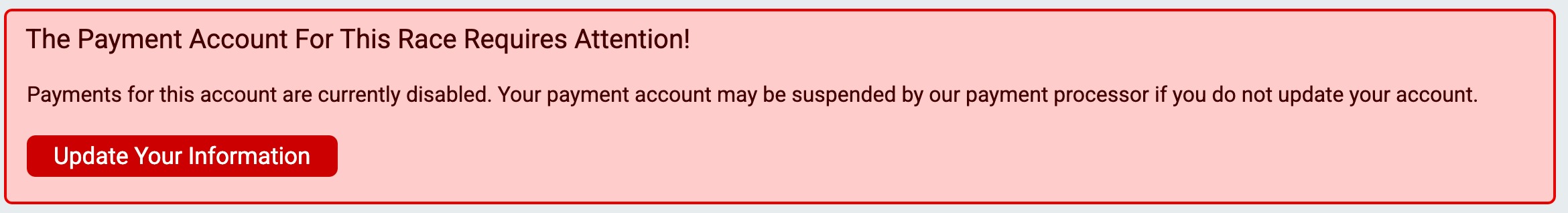 You will see the red banner message at the top of your dashboard that says "The payment account for this race requires attention!" if you need to verify your payment account.