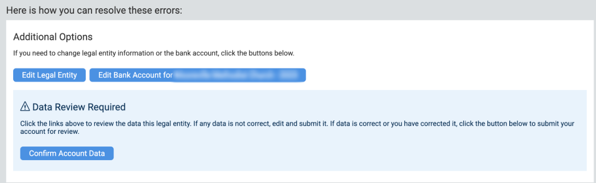 Once you click the button, you will be taken to the legal entity page of the payment account. You will see this message about the error found prompting you to review the legal entity information: