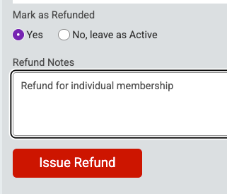 Before issuing the refund, you must select if you would like to mark the membership as "refunded" so that it is no longer active or if you would like to leave the membership as active.