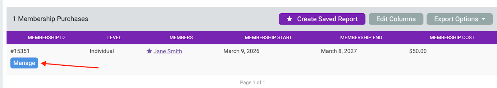 Once you have enough funds in the Refund Reserve to perform the refund, you can initiate the refund. Search for the membership using one of the membership reports (Reports >> Membership Purchases or Reports >> Individual Members) or use the member search in the top right of the dashboard. Once you have found the membership, click Manage.