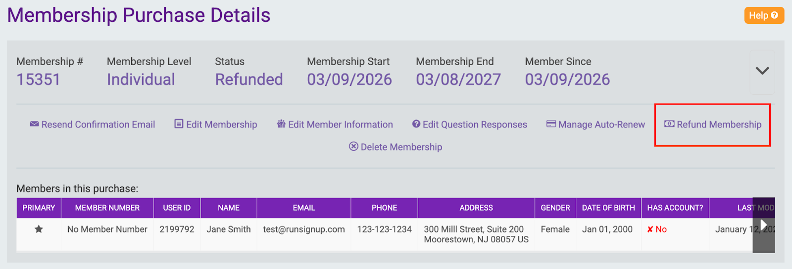 From the Membership Purchase Details, select Refund Membership.
