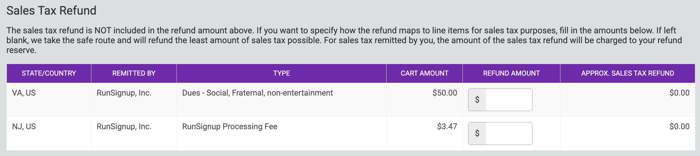 The sales tax refund is NOT included in the refund amount above. If you want to specify how the refund maps to line items for sales tax purposes, fill in the amounts below. If left blank, we take the safe route and will refund the least amount of sales tax possible. For sales tax remitted by you, the amount of the sales tax refund will be charged to your refund reserve.
